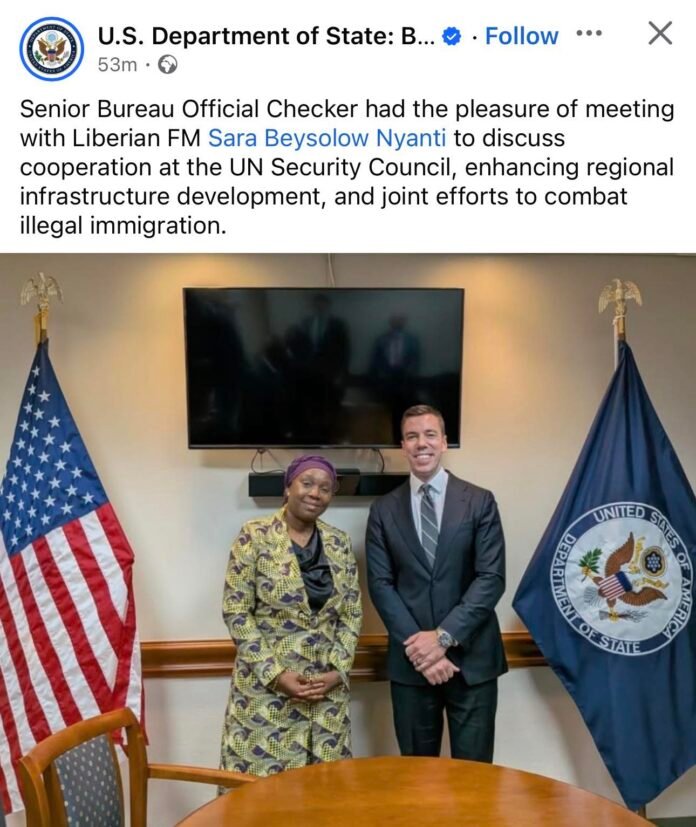 MONROVIA, LIBERIA-The Minister of Foreign Affairs, Sara Beysolow-Nyanti, has held official consultations at the U.S. Department of State with the Senior Bureau Official at the Bureau of African Affairs, Nick Checker.